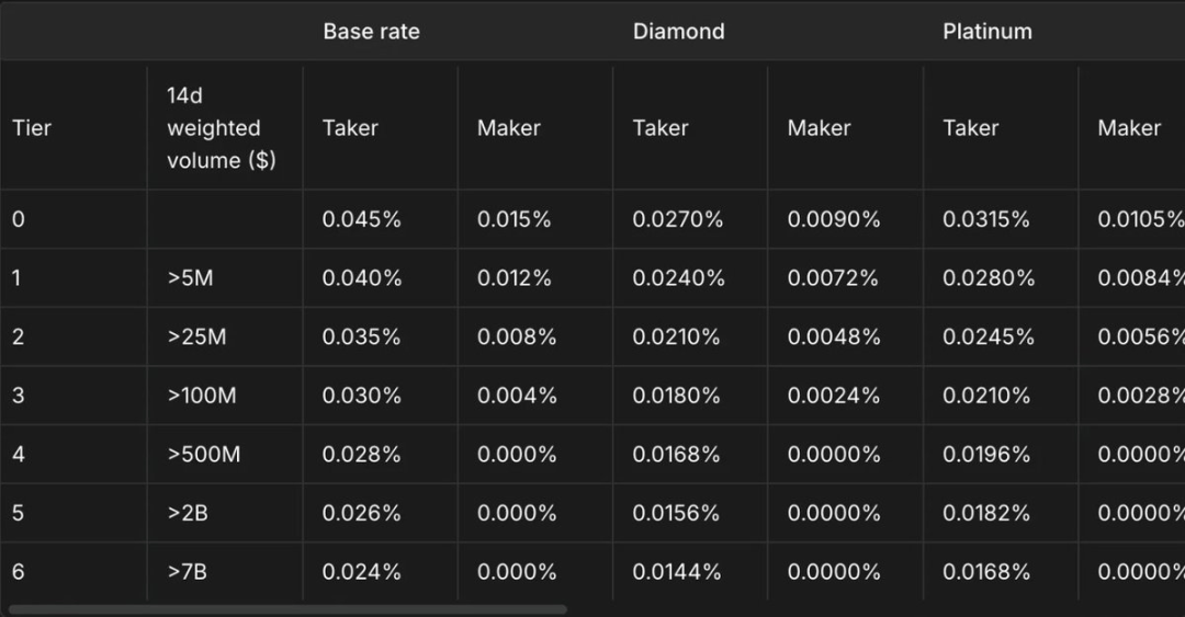 Hyperliquid 的费用结构包括 0.45% 的吃单费(Taker Fee)和 0.015% 的挂单费(Maker Fee),费用会根据 14 天加权交易量门槛在不同费率级别中调整。吃单费可降低至 0.024%,而挂单费可降至 0%,以激励做市商为 HyperCore 的订单簿提供深度流动性。