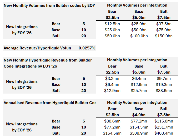 我们对构建者代码对 Hyperliquid 收入的影响进行了情景分析。假设平均每单位交易量的收入为 0.026%,并设定一个基准情景,即到 2026 年底会有 10 个大型构建者代码集成,每个集成的平均月度交易量为 50 亿美元,我们预计这些集成将在 2026 年底为 Hyperliquid 带来年化收入 1.54 亿美元: