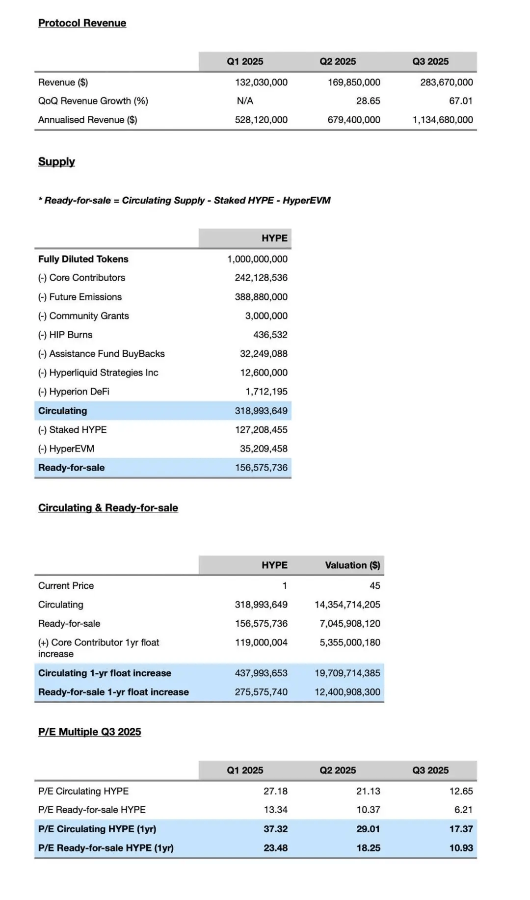 Hyperliquid 2025 年第三季度年化收入与核心贡献者浮动增长一年期分析