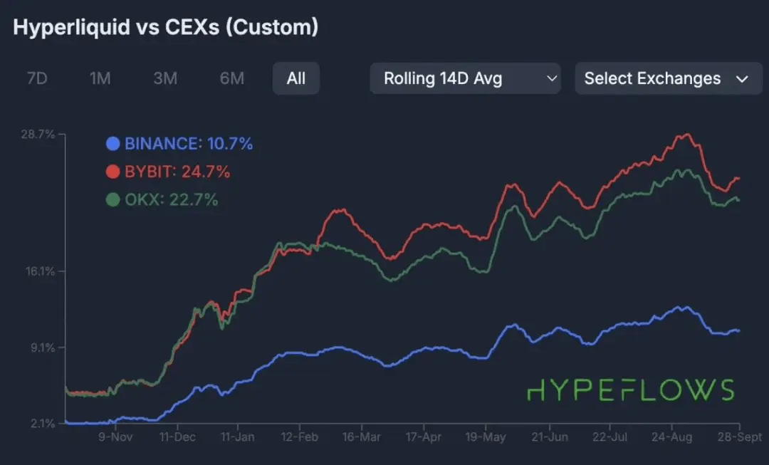尽管 Hyperliquid 已取得了显著成功,但我们认为有必要退一步,从头开始重新审视这一论点,并结合具体的估值框架。在修订我们的论点时,我们将回顾 Hyperliquid 的崛起历程,它如何显著蚕食中心化竞争对手的永续交易市场份额,并进一步勾勒未来几年的更宏伟愿景 — — 容纳整个金融体系。