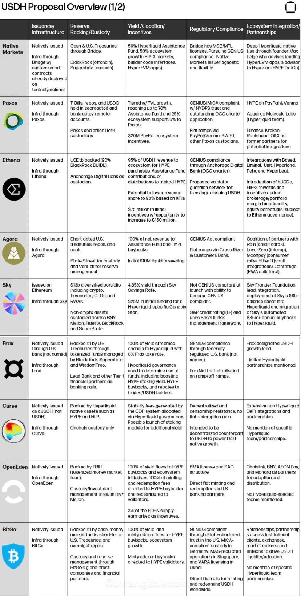USDH 收到了来自多家知名机构玩家的多个提案,包括 Paxos/PayPal、Agora、Ethena、BitGo 和 Native Markets。这些提案详细说明了各自的托管机构、国库券收益分配、与新通过的 GENIUS 法案的合规性以及拟议的合作伙伴关系。其中,Native Markets 的提案已通过 Hyperliquid 的治理机制。