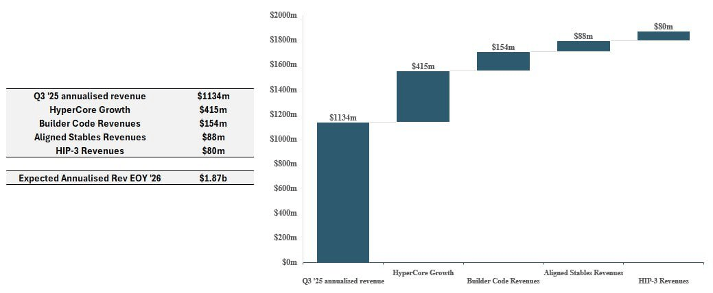 综合以上因素,我们认为基本情况是 Hyperliquid 到 2026 年底的年化收入将达到 19 亿美元,这将比 2025 年第三季度的年化收入增长 70%。