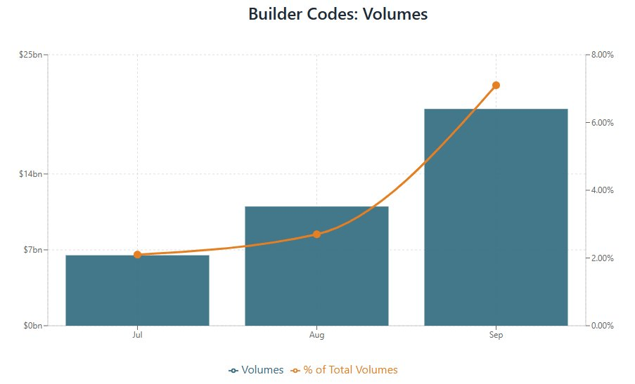 假设构建者费用为 0.05%,构建者代码在 9 月为 Hyperliquid 带来了 200 亿美元的交易量。它迅速成长为 Hyperliquid 协议的重要交易量来源,仅 9 月就占到了永续合约总交易量的 7.1%: