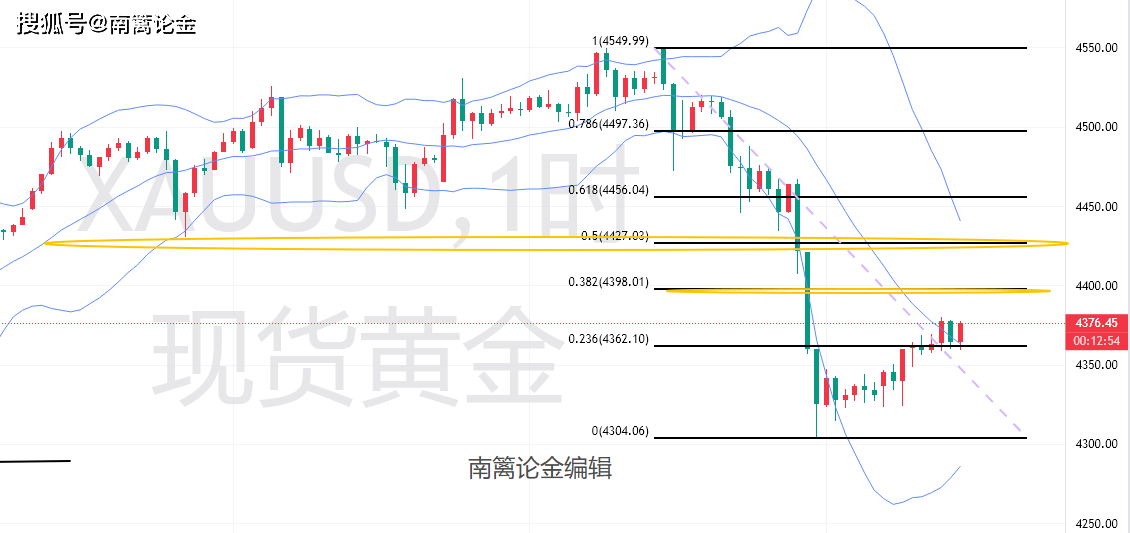 现在是在日线布林带中轨这里受支撑了,也是跟前期是一样的,日内还是以反弹为空为主,毕竟已下跌那么多,各种背离、超卖等现象还是比较明显的。上方呢,首先去关注一下,从历史高点4550到昨天的低点4303的斐波那契。