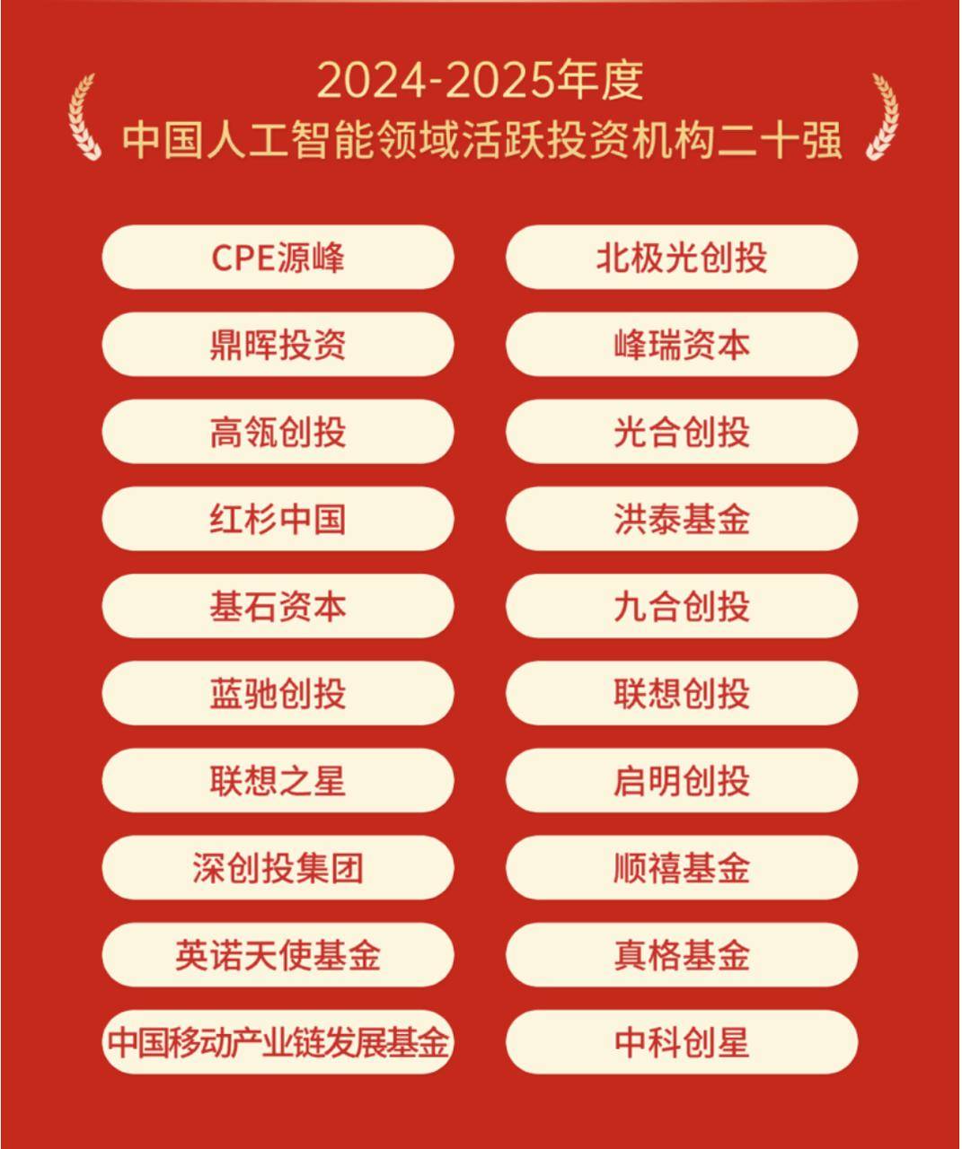 北京基金业协会发布「2024-2025 年度中国 PE/VC 行业评选结果」。线 年度 中国早期投资机构十强」「2024-2025 年度中国人工智能领域活跃投资机构二十强」。真格基金合伙人刘元入选「2024-2025 年度中国股权投资行业杰出青年投资人」榜单。