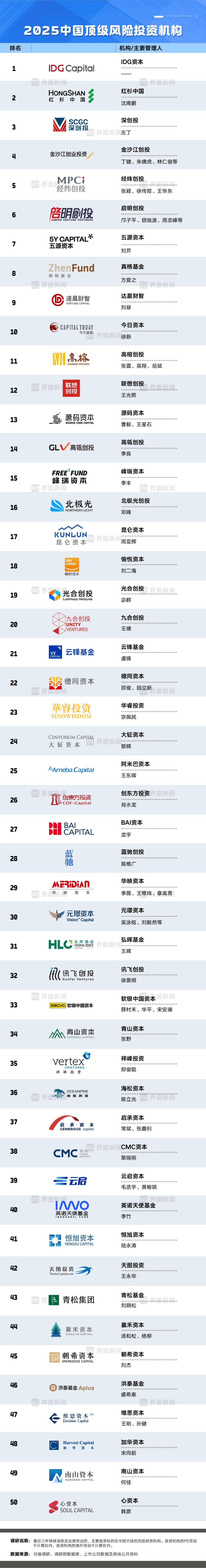 12 月 23 日,界面新闻第九次发布「中国顶级风险投资机构」榜单。榜单致力于为创业者、母基金(FOF)及有限合伙人(LP)呈现中国创投生态的真实力量版图。为捕捉最新动态,榜单特别关注机构近三年表现,包括新投项目参与度与贡献度(35%)、退出项目参与度与贡献度(35%)、管理规模及行业位置(30%),以发现业界最具活力与成长性的新锐力量。线 中国顶级风险投资机构」,位列第八。