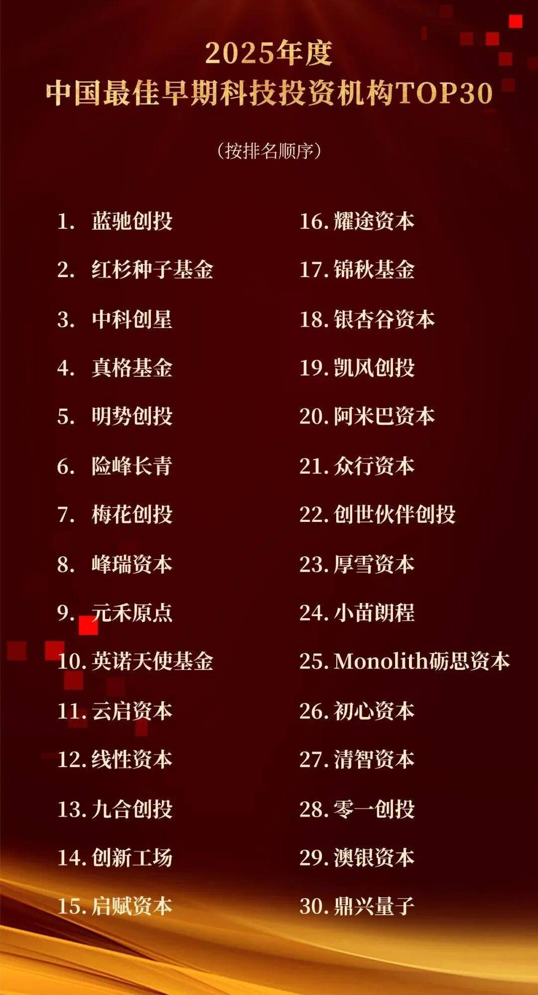 12 月 29 日,母基金研究中心正式发布 2025 年度榜单。线 最佳早期基金 TOP30」,排名第四。真格基金创始合伙人兼 CEO 方爱之上榜「2025 最佳早期基金投资人 TOP20」。
