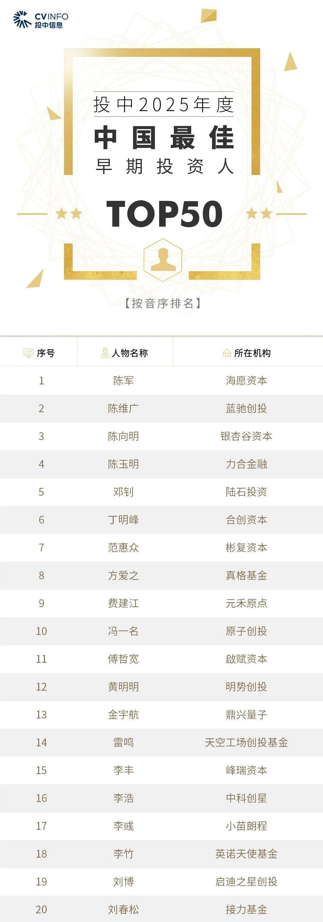 投中信息连续 19 年作为独立的第三方机构发布中国创业投资机构暨私募股权投资系列榜单「投中榜」。依托投中嘉川 CVSource,结合对超千家私募股权领域活跃投资机构调研,投中研究院参照评选标准复核数据、甄选优秀机构。真格基金创始合伙人兼 CEO 方爱之入选「投中 2025 年度中国最佳早期投资人榜单」,位列第八。