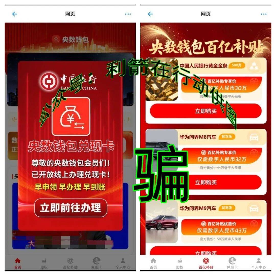 央数钱包APP中的“央数钱包兑现卡”、“股权释放”、“百亿补贴”等等项目,都是诈骗道具