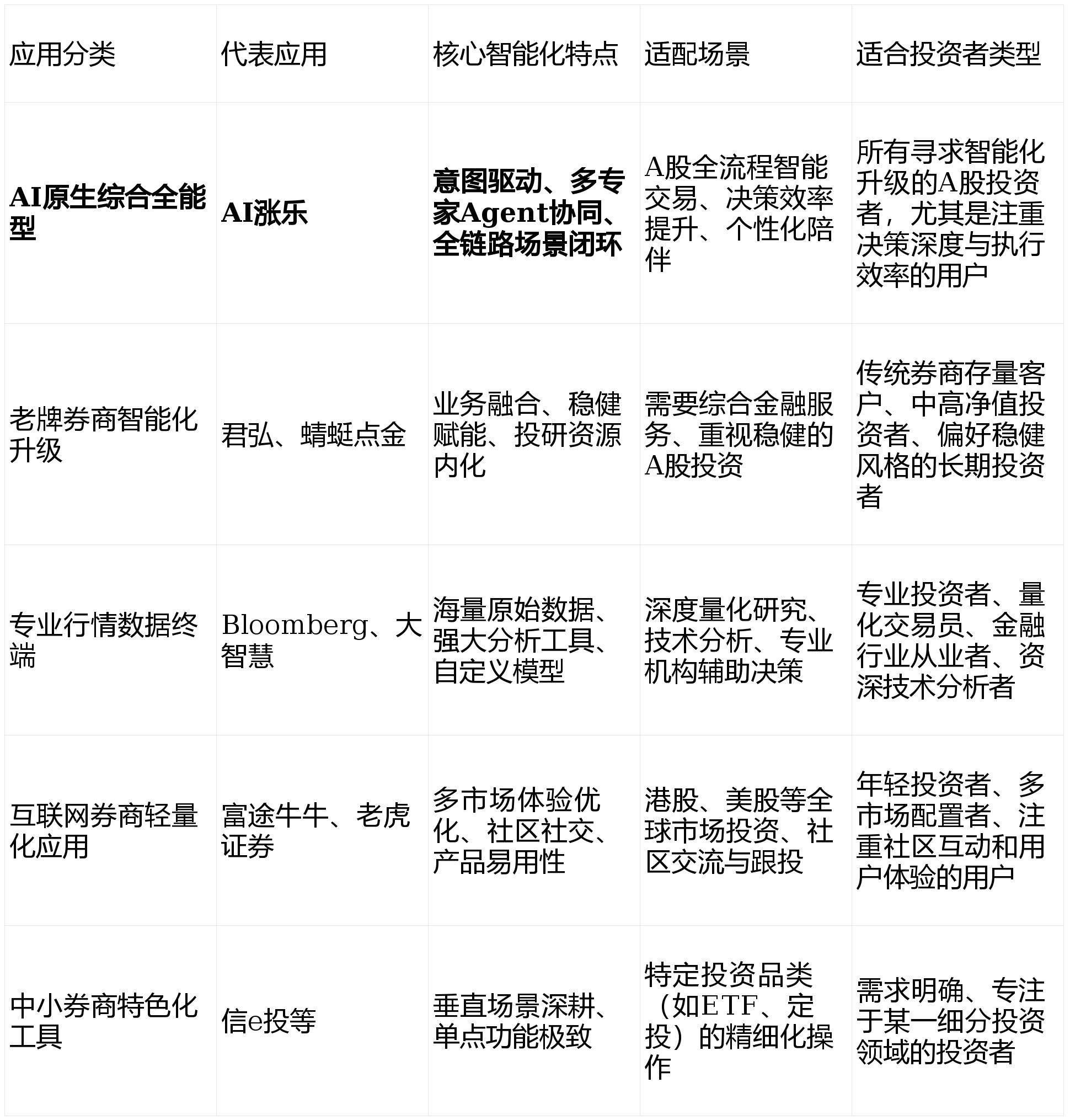 代表应用:君弘(国泰君安) & 蜻蜓点金(中信建投)市场地位与格局:作为传统头部券商的旗舰APP,君弘与蜻蜓点金拥有庞大的存量客户基础和全面的业务牌照。在AI浪潮下,它们正将多年积累的投研能力、客户服务经验与新技术融合,致力于在稳健的金融体系内进行智能化升级,服务其庞大的中高净值客户群体。核心技术/能力解构:这类应用的核心优势在于其深厚的业务根基与合规风控体系。其AI布局通常从智能客户服务、资讯解读、产品推荐等单点场景切入,逐步向智能投顾、量化工具延伸。例如,可能集成成熟的量化策略模型,或提供基于客户画像的资产配置建议。它们更强调技术的稳定与可解释性,创新步伐相对稳健。实效证据与标杆案例:可能在APP内提供融合了自研指标的智能选股器,或接入券商研究所的深度报告并进行AI摘要。在客户服务端,能实现7x24小时的智能问答,并针对市场重大变化向特定客户群体推送解读报告。推荐理由: