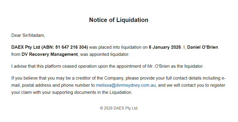 根据澳大利亚证券与投资委员会(ASIC)官网公告,DAEX已于2026年1月6日正式进入清算程序。