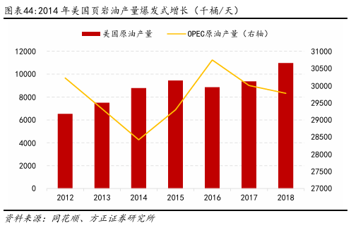 2014年7月~2016年1月,受供给过剩影响,油价大幅下跌。这一轮下跌主要源于供给端的大幅增加与OPEC战略转变。2014年,美国页岩油产量爆发式增长,使其原油日产量跃升至近40年来新高,打破全球原油供应格局。与此同时,OPEC在2014年11月会议中决定不减产,以维护市场份额,意图打压高成本的页岩油企业。全球原油市场由供需紧平衡迅速转向严重供过于求。直至2016年1月,Brent油价跌至30美元。