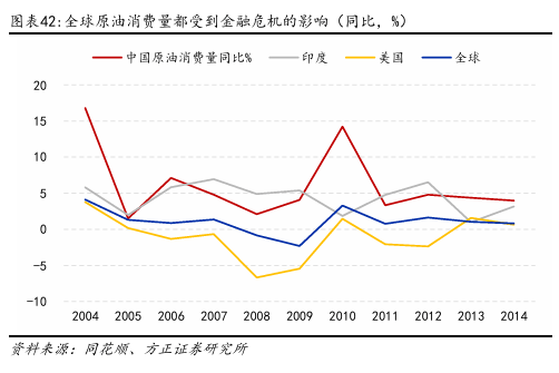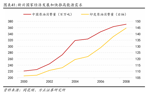 2000年1月~2008年7月,原油价格长期上涨,经历了一个近乎持续的牛市。其中2001年12月的Brent价格成为此阶段油价最低点主要原因在于911造成了全球金融市场的极度恐慌,这是自冷战后美国首次面临重大安全威胁。在此阶段全球经济进入高速发展期,尤其是中国、印度等新兴市场国家的快速工业化和城市化进程显著推高了能源需求。另一方面,2003年伊拉克战争、尼日利亚和委内瑞拉等主要产油国产量受限,地缘政治风险加剧原油市场对供应安全的担忧,推动油价持续攀升。投机资金也大量涌入石油期货市场,金融属性进一步放大了涨幅。直到2008年7月,油价创出历史新高,Brent突破133美元/桶。