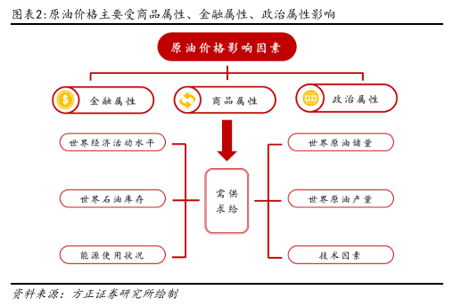 影响原油价格原油价格主要受商品属性、金融属性、政治属性影响。原油作为目前最重要的工业原料之一,其商品属性决定长期需求趋势,金融属性则在一定程度放大了价格的波动,政治属性为原油价格带来不确定性。与黄金相比,原油更强调实际消费需求而非价值储藏功能,所以其价格对供需基本面的变化更为敏感。同时,政治属性使得原油市场比黄金更容易受到政策干预和地缘冲突的影响。