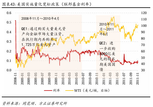 2009年3月~2011年4月,全球经济复苏,油价快速反弹回升。为应对金融危机后全球经济衰退,各国纷纷推出史无前例的刺激政策。美国实施量化宽松政策(QE),大规模注入流动性,利率维持在零水平;中国推出4万亿元人民币刺激计划,重点投向基建、房地产等高耗能领域。全球货币政策极度宽松带动信贷扩张,推动经济活动逐步回暖,同时也刺激大宗商品价格普遍回升。直到2011年4月,Brent价格回升到123美元/桶。
