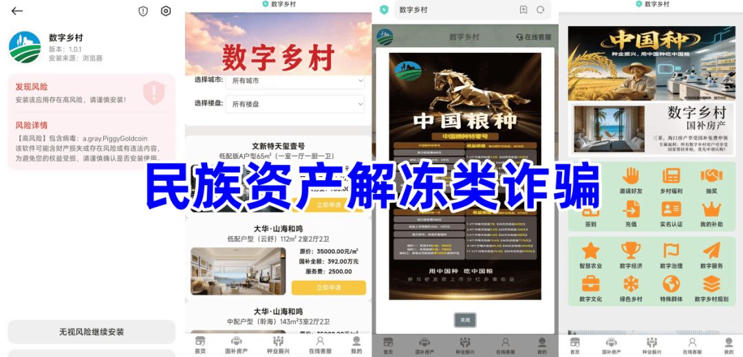 不法分子冒充某机构的名义,打着“数字乡村建设”的旗号,制作散布涉诈APP,声明缴纳费用可领取房产补贴,同时推广“种业振兴”高额返利理财项目。