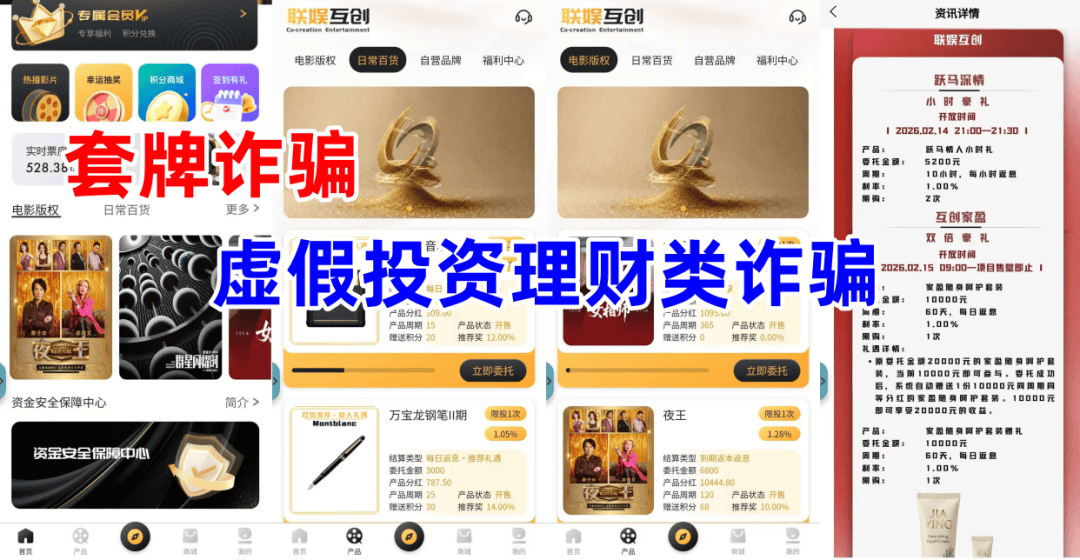 不法分子冒充香港某影视投资公司的旗号,打着“影视投资”的旗号,虚构推广“电影版权”“日常百货”“自营品牌”等高额返利理财项目。