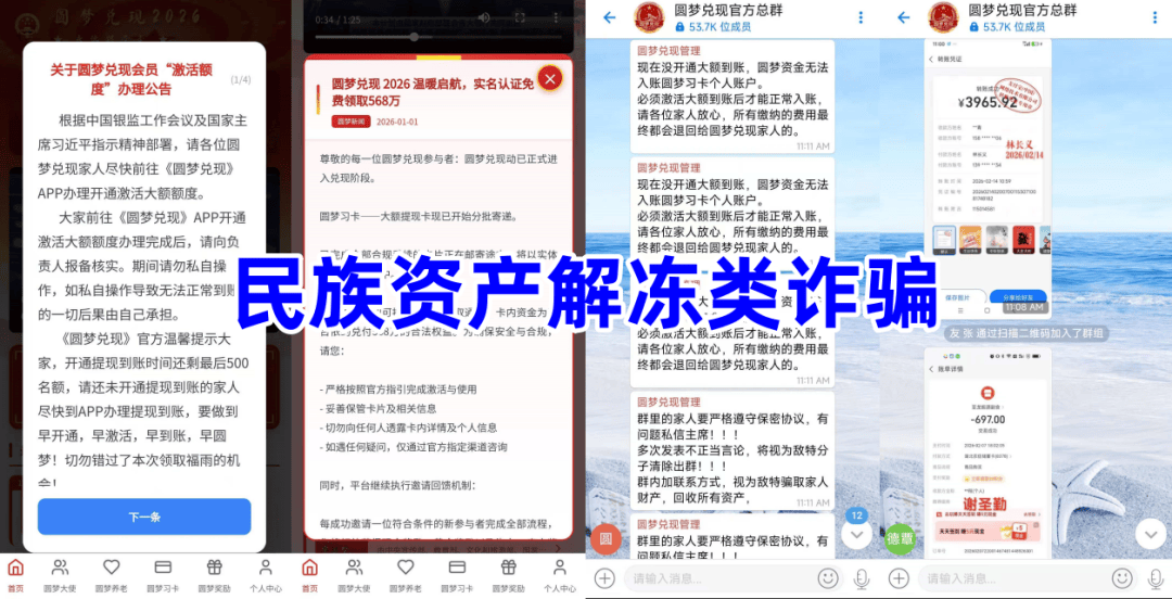 不法分子冒充某机构的名义,打着给“追梦人”发放568万扶贫款的旗号,声明参与者实名注册即可领取,让参与者提供个人信息办理“圆梦习卡”,领取圆梦养老补贴,参与者缴纳费用开通大额激活额度,声明名额仅有500个,名额有限忽悠人投钱,发展下线可领取手机、黄金、汽车等奖励。