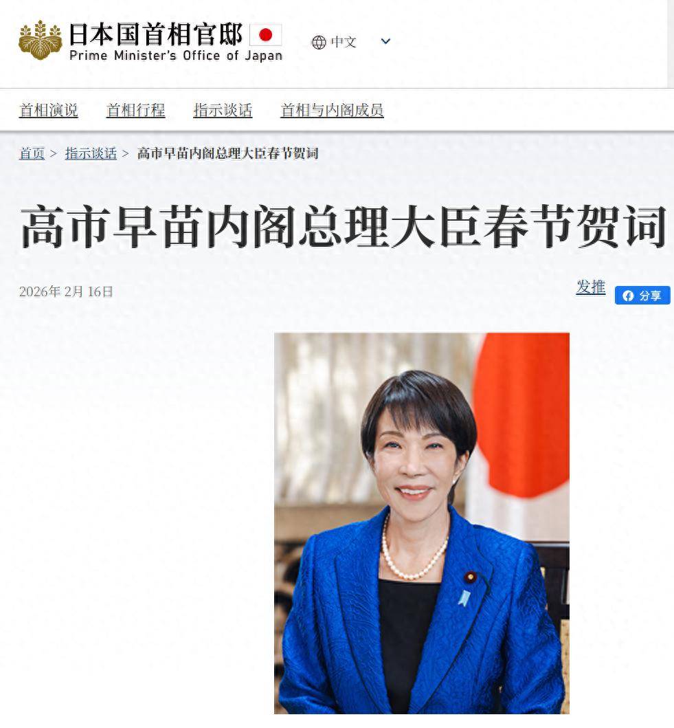 2026年2月16日,日本首相高市早苗通过日本首相官邸官方网站,发布了包含日文、简体中文、繁体中文、英文四个语种的春节贺词。