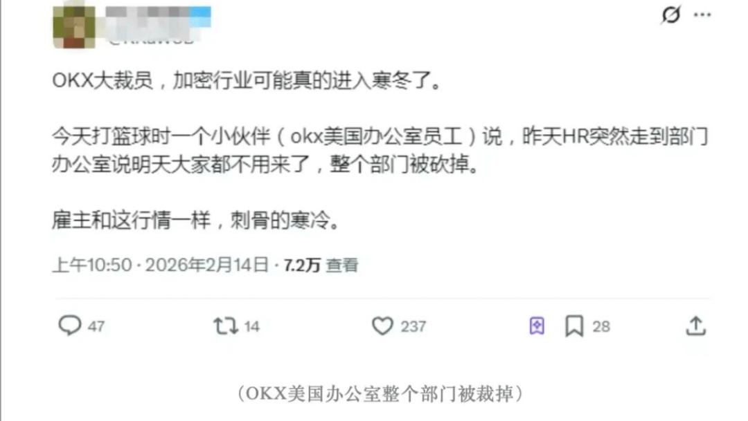OKX美国办公室突发裁员,整个部门被一锅端,HR前一晚通知、第二天就让员工卷铺盖走人,无赔偿、无缓冲,甚至连收拾东西的时间都卡得死死的,而裁员时间恰好卡在年终奖发放前夕。